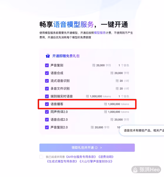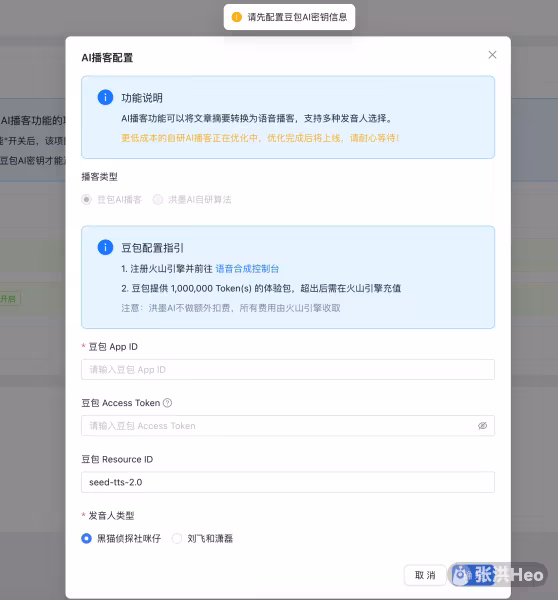我们可以点击“试用”按钮,然后复制APP ID、Access Token到洪墨AI的播客界面中。